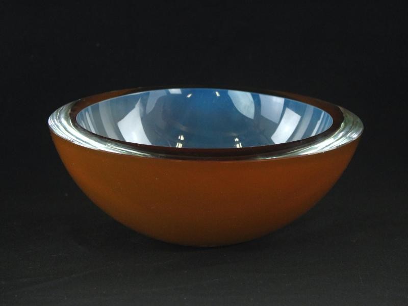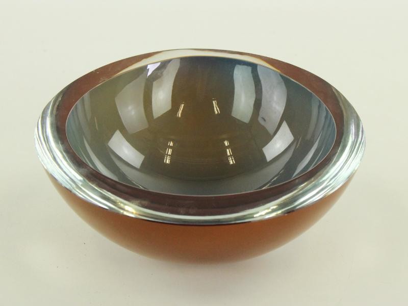 Deze handgemaakte glazen schaal kenmerkt zich door een verfijnde vormgeving en een harmonieus kleurenspel: een warme amberbruine buitenzijde gecombineerd met een blauwgrijze binnenkom en een heldere glazen rand. Het samenspel van transparantie en kleur geeft het object een luxueuze en tijdloze uitstraling.