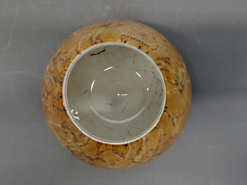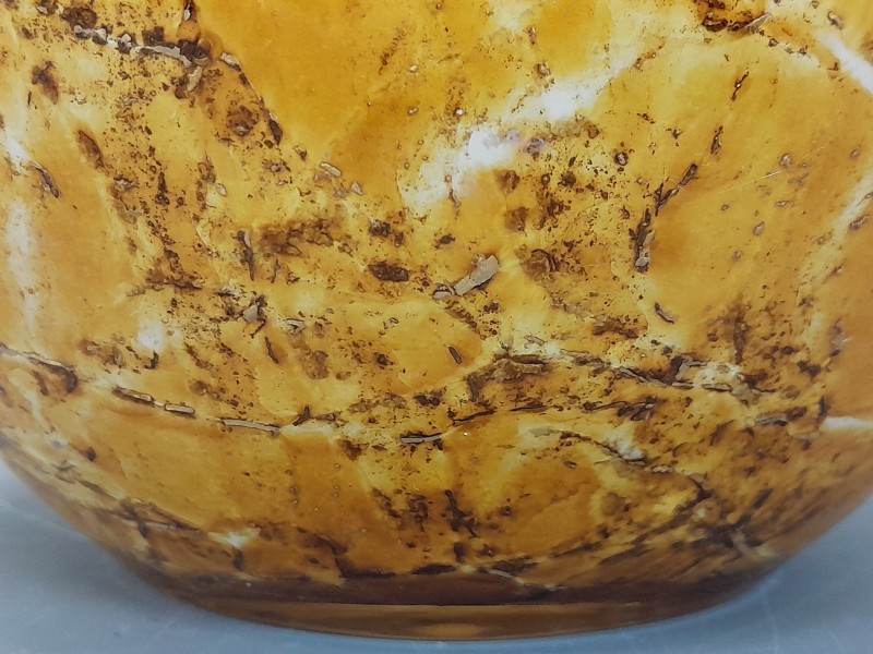 - De vaas is opgebouwd uit drie lagen glas: een witte binnenlaag, een warme oranje middelste laag met subtiele bruine vlekpatronen, en een transparante buitenlaag die diepte en glans toevoegt.