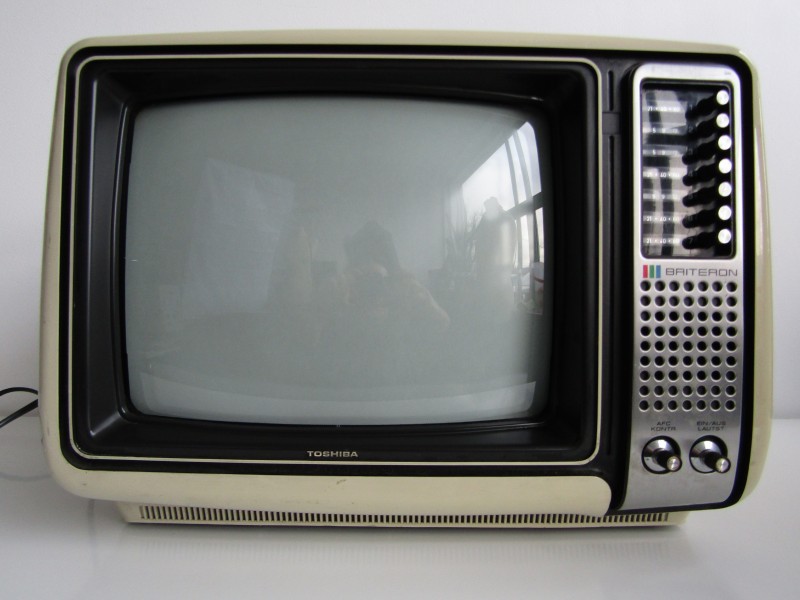 Draagbaar retro Tv-toestel van het Japanse merk: "Toshiba" met als model de: "Briteron / Farbfernseher, Modell Nr. C-400A/1973". Deze verschijning uit begin jaren '70 heeft een mooi design in kunststof en heeft een kleurentelevisiescherm van 36 cm. Achteraan kan je de info van deze Toshiba Tv terug vinden (zie foto's).