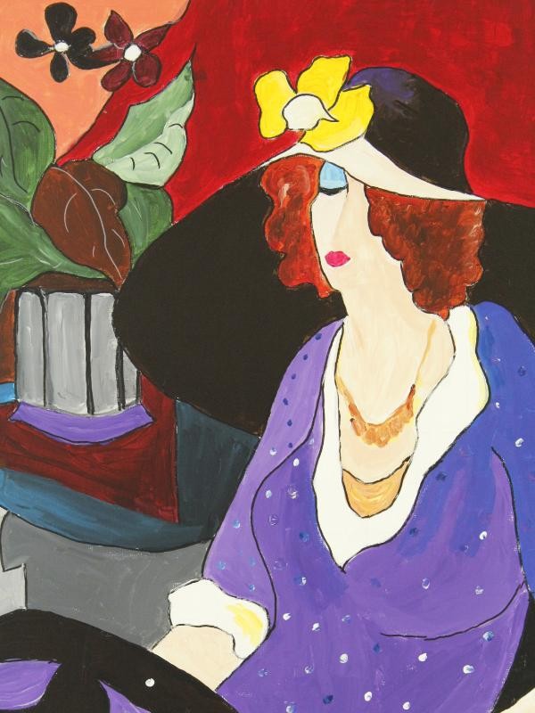 Portret links: Een dame met een grote zwarte hoed en een paarse jurk, omringd door planten en meubels. Het kleurgebruik in paars, rood en geel brengt een levendige harmonie.