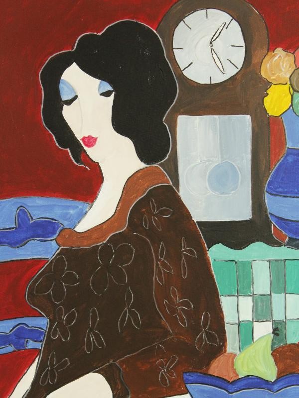 Portret midden: Een vrouw met zwarte haren en een felrode achtergrond, gehuld in een jurk met decoratieve motieven. De compositie ademt elegantie en introspectie, versterkt door de sterke contrasten in kleur.