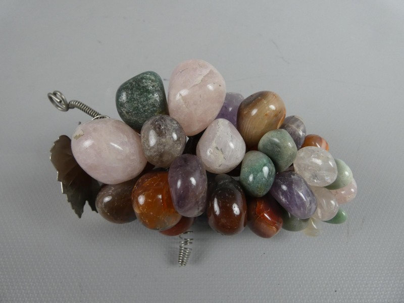 Unieke decoratieve druiventros, handgemaakt van een assortiment getrommelde edelstenen in diverse kleuren, zoals rozenkwarts, amethist en agaat. Een schitterend en kleurrijk accent voor elk interieur. Compleet met een metalen blad en krul als steel en rank.