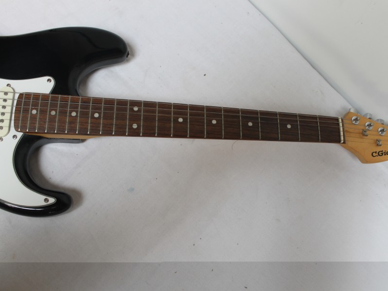 Een rechtshandige elektrische gitaar van het merk C. Giant, ontworpen naar het model van een stratocaster. De snaren zijn intact maar voor de rest geen andere accessoires aanwezig. De gitaar heeft 3 pick-ups, waarvan de onderste in een schuine positie staat.