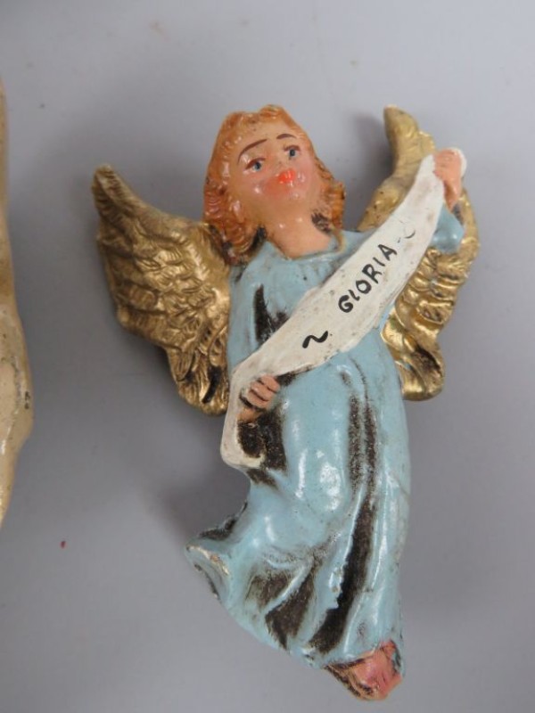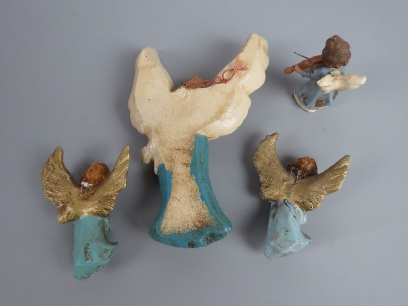 Set van vier kleine, handgeschilderde kerst- of kerststalbeeldjes van engelen.