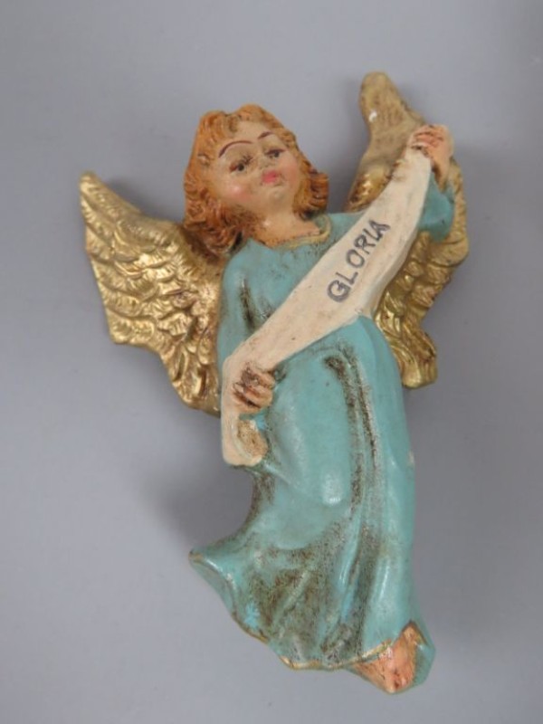 Twee Kleine Engelen (6 x 9 cm): Deze zijn kleiner en tonen een vergelijkbare stijl, maar met een andere pose. Ze houden een witte banderol vast met het enkele woord "GLORIA". Hun vleugels zijn volledig in een diep goudkleurige metallic verf geschilderd.