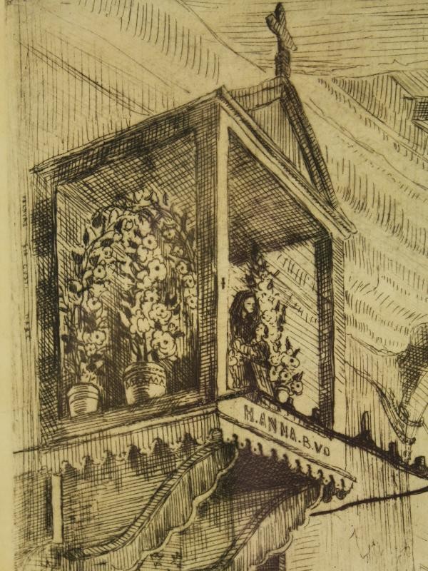 Ets met zicht op de Antwerpse Vlaaikensgang. De ets is onderaan in potlood getiteld, genummerd en gesigneerd met: Vlaaikensgang (St. Anna), 47/100, Rom. Malfliet.