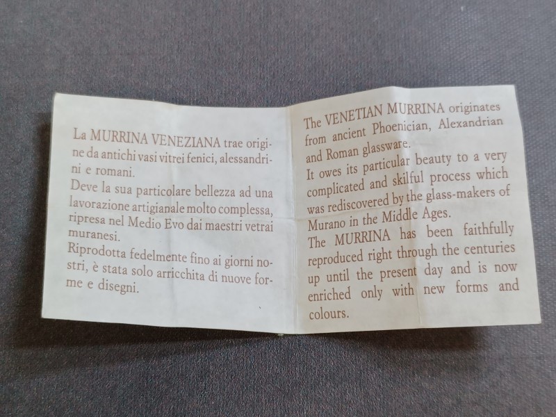 - Merk: Geregistreerd onder de naam "Antica Murrina Veneziana", wat staat voor traditioneel Venetiaans vakmanschap en hoge kwaliteit.