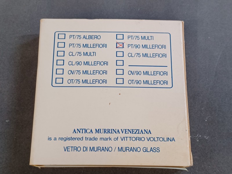 - PT/90 Millefiori: Volgens de verpakking is het item gecodeerd als 'PT/90 Millefiori' (het vakje is aangekruist), wat waarschijnlijk de vorm, grootte en het type techniek binnen de collectie aangeeft.