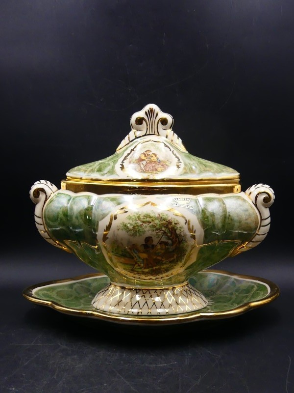 Prachtige handgemaakte Fait Main keramieken siervaas komt met een bijpassend bord, beide versierd met een verfijnde 'Galante Scène' en rijk beschilderde accenten.