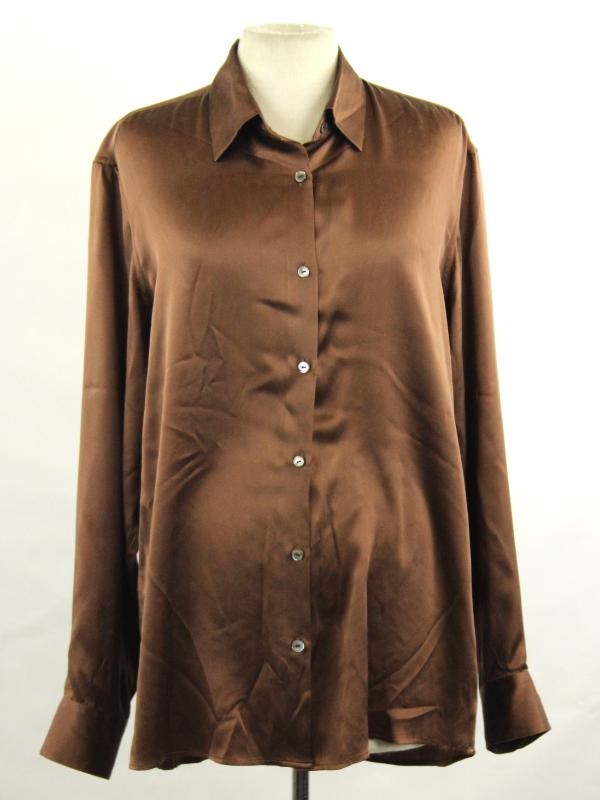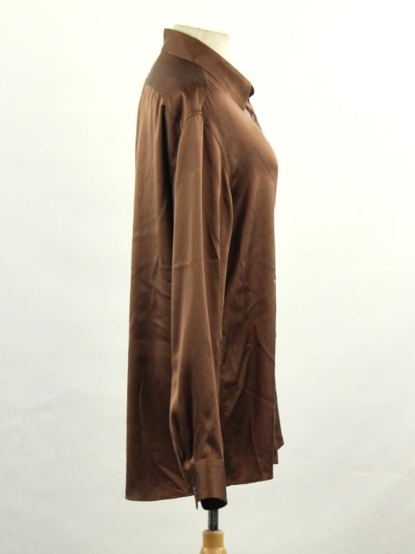 Feestelijke, zijden dameshemd van Dries Van Noten. Het dameshemd is gemaakt uit 100% zijde in een warme, glanzende kleur bruin. De glans geeft het hemd een extra touch en maakt het uitermate geschikt voor de feestdagen.