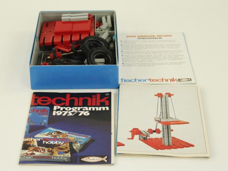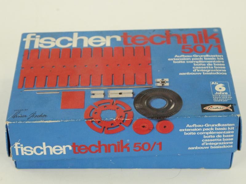 Deze vintage fischertechnik 50/1 Aufbau-Grundkasten betreft een klassieke constructieset uit de jaren 1970, geproduceerd in West-Duitsland. De set is bedoeld als uitbreidings- en basisdoos binnen het fischertechnik-systeem en bevat diverse rode en grijze bouwelementen, wielen, assen en verbindingsstukken.
