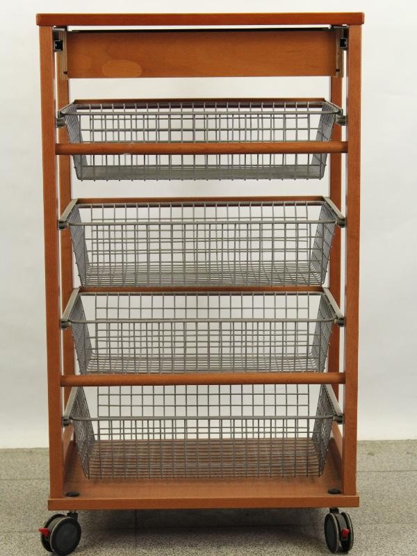 De kast is vervaardigd uit hout en uitgerust met meerdere uitschuifbare metalen manden, elk voorzien van een houten handvat.