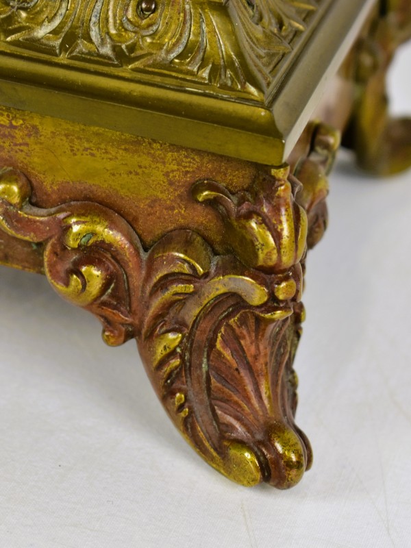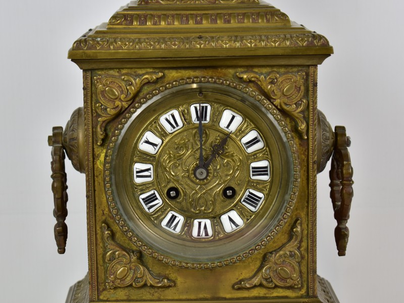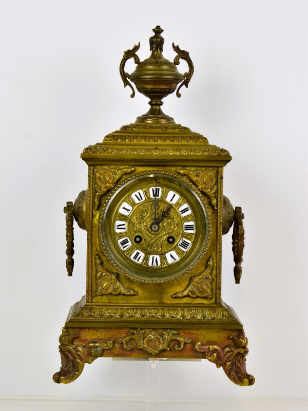 Sierlijke schoorsteenklok uit Frankrijk, vermoedelijk uit de tweede helft van de 19e eeuw. Het ontwerp volgt de neoklassieke stijl, met rijke versieringen in reliëf, symmetrische vormen en een decoratieve vaas bovenop. De klok is gemaakt van metaal met een vergulde afwerking. De wijzerplaat toont Romeinse cijfers op witte cartouches, omringd door een fraai gegraveerd middenveld. Aan de zijkanten bevinden zich gedraaide handvatten. De achterzijde geeft toegang tot het uurwerk en het slagmechanisme met bel. De bijhorende opwindsleutel is aanwezig. De klok vertoont duidelijke stijlkenmerken van Japy Frères, een bekende Franse fabrikant van hoogwaardige klokken in de 19e eeuw. Hoewel het object niet gesigneerd is, is de toeschrijving aan deze fabrikant zeer goed mogelijk op basis van ontwerp en uitvoering.