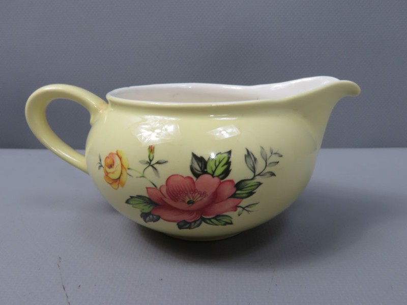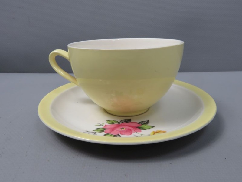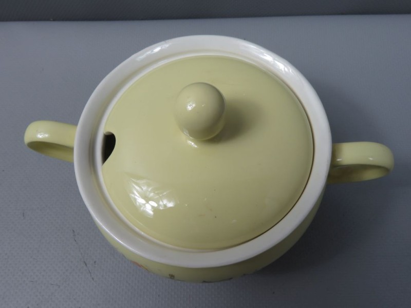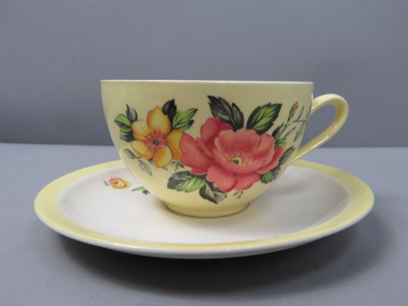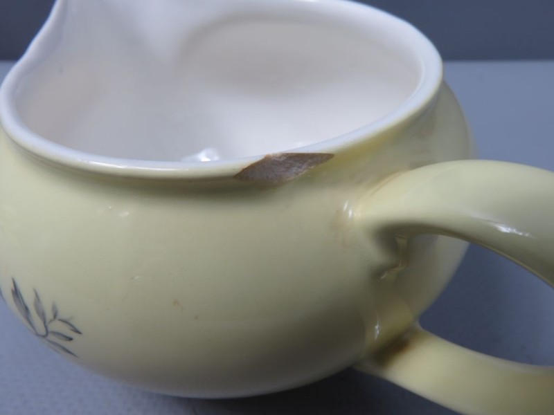 - Kleur: De basiskleur van het aardewerk is een zachte, effen pastelgele kleur, zowel aan de buitenkant als op de randen van de schotels. De binnenkant van de koppen en kannen is wit.