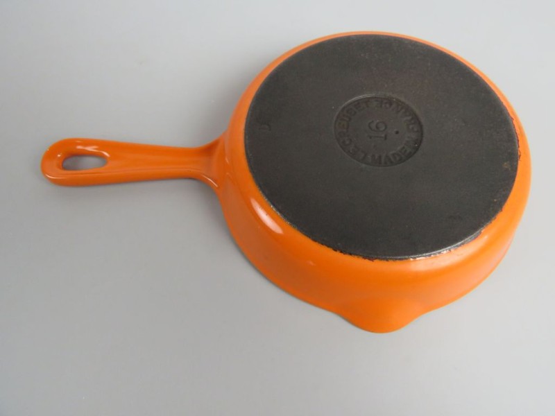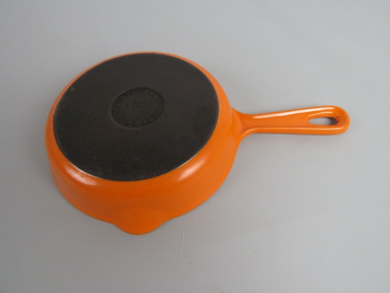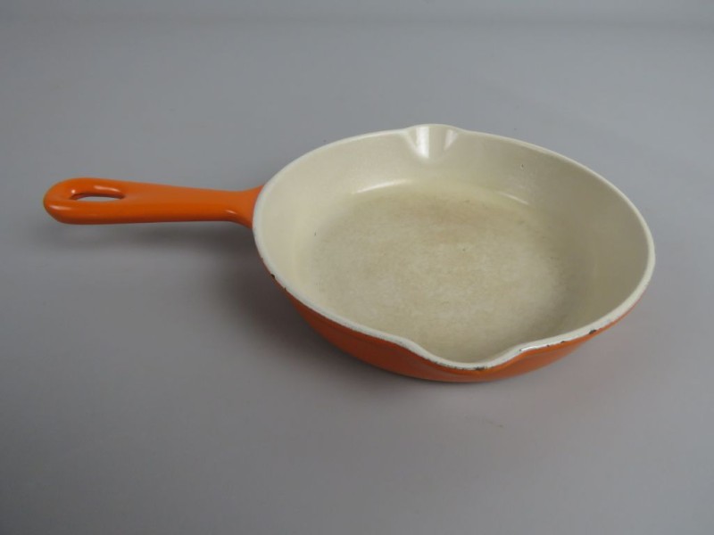 Dit is een vintage geëmailleerde gietijzeren koekenpan (of steelpan) vervaardigd door Le Creuset, een gerenommeerd Frans bedrijf.