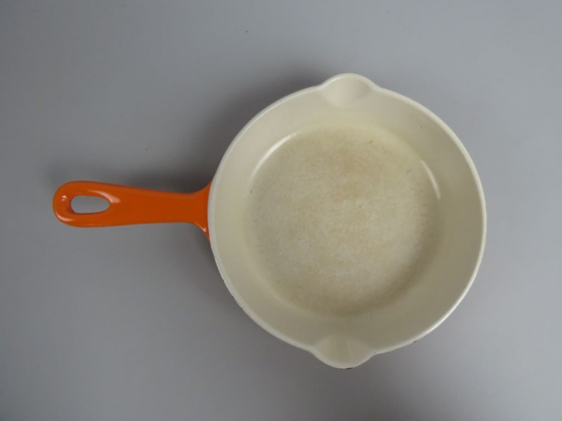 Bodem: De niet-geëmailleerde onderkant van de pan heeft een donkere, ruwe gietijzeren afwerking.