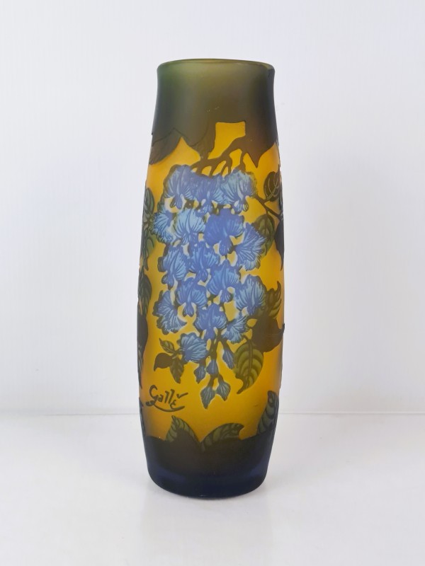 Deze decoratieve vaas is gemaakt van meerlagig glas en toont een ingeëtst florale decoratie met blauwe bloemen en bladeren tegen een geel-bruine achtergrond. De vaas draagt de gesigneerde naam Gallé, wat verwijst naar Émile Gallé (1846–1904), een bekende Franse glaskunstenaar uit de art nouveau-periode. Waarschijnlijk gaat het om een latere reproductie of hommage aan Gallé, gezien de afwerking en het ontbreken van een diep ingegraveerd merkteken. Toch is de vaas zeer decoratief en geliefd bij liefhebbers van art nouveau-stijl. Het ontwerp toont verfijnde details, met heldere kleuren en een subtiele overgang tussen de lagen glas. Deze techniek staat bekend als camee-glas, waarbij patronen in het glas worden geslepen en gezandstraald.