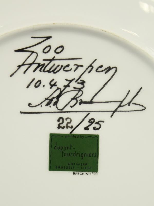 Twee porseleinen borden van de Zoo Antwerpen, uitgegeven in 1973 in beperkte oplage. Beide borden zijn voorzien van de vermelding 'Dupont-Fourdrigniers Antwerp Bruxssels Liege Batch 723'.