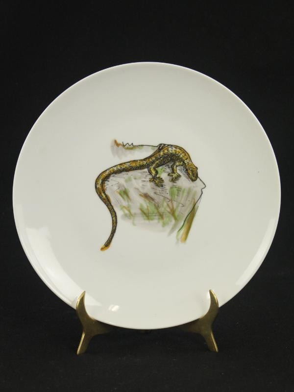 - Bord 2 toont een salamander op grote, grijze steen. Op de achterkant gesigneerd met 'Zoo Antwerpen 10.4.73 25/25'. Verder ook voorzien van een onleesbare handtekening.