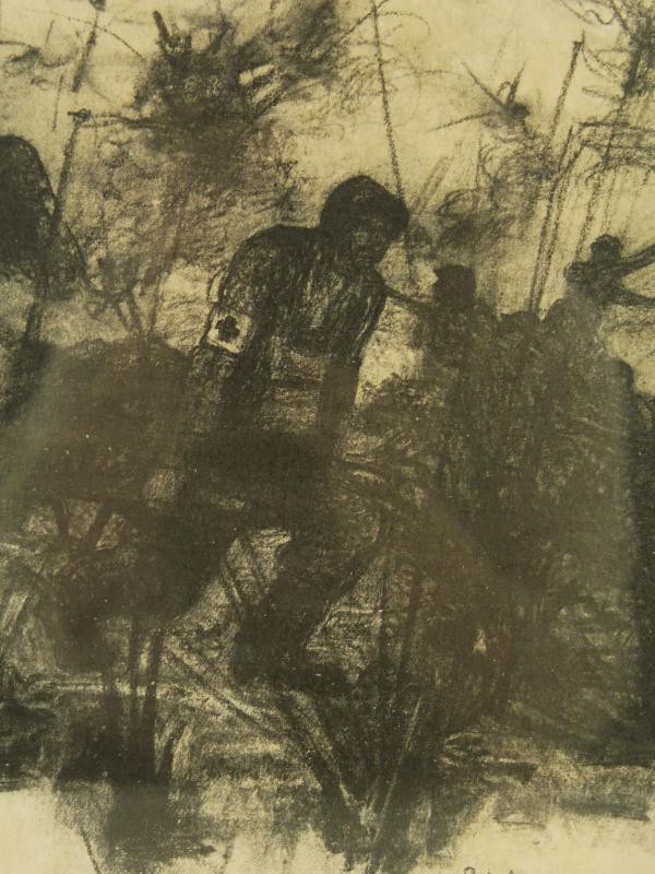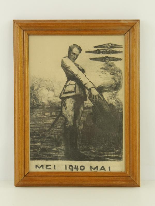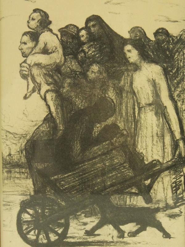 Geprint drieluik dat de tragedie en de menselijke impact van de oorlog in mei 1940 verbeeldt. De drie prints, elk afzonderlijk ingelijst in een eenvoudige houten lijst, tonen scènes in zwart-wit. Ze zijn vermoedelijk geïnspireerd op werk van Edouard Vereycken (1893-1965), aangezien in de print de handtekening 'Ed Vereycken' te vinden is.
