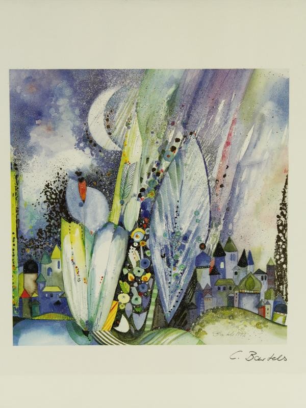 Deze gesigneerde kunstprint “Träumerei” van C. Bartels (1992) toont een kleurrijke, dromerige compositie waarin abstracte florale vormen samengaan met een fantasierijk stadsgezicht. De prent is tweemaal gesigneerd: op de kunstprint zelf met potlood “Bartels 92” en op de passe-partout met C. Bartels. Het werk heeft een poëtische, bijna sprookjesachtige uitstraling, typerend voor de karakteristieke beeldtaal van Bartels.
