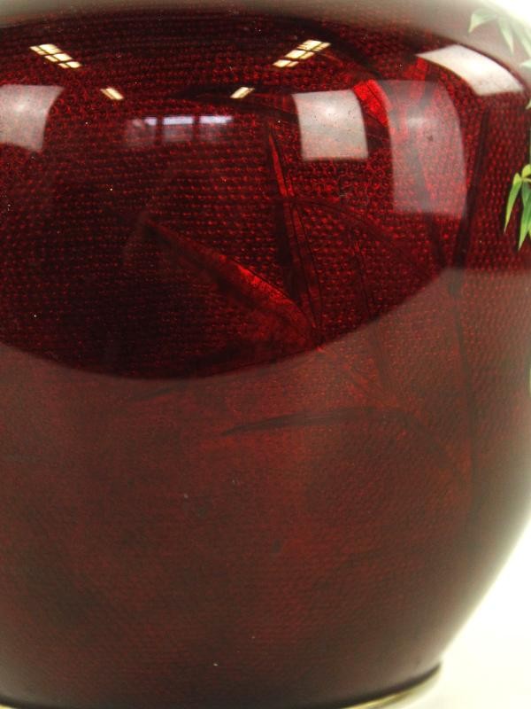 Vaas uit metaal met een klassieke bolvorm in diepe, wijnrode kleur en een verfijnd bloemenmotief van o.a. kersenbloesem. De bladeren zijn aangebracht met behulp van de cloisonné-techniek, waardoor de bladeren zijn omlijst met een goudkleurig randje. De vaas is voorts afgewerkt met de Ginbari-techniek, waardoor er allemaal kleine stippeltjes in het rode metaal zitten. Dit creëert een mooi, glanzend effect. De vaas is onderaan gemerkt maar dit is moeilijk leesbaar: we onderscheiden het opschrift 'Rog England'.