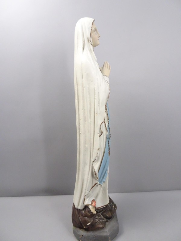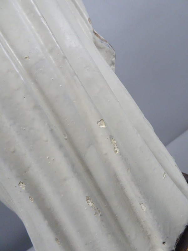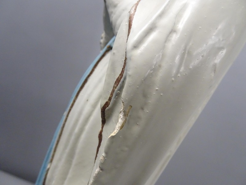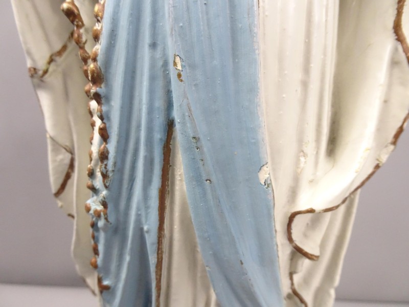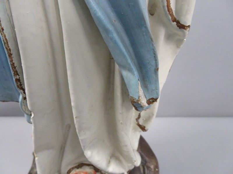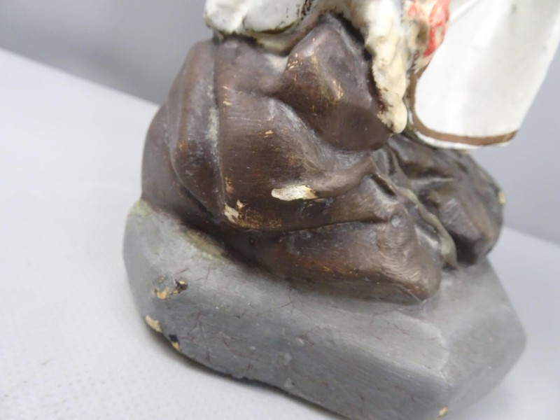 Zwaar beschadigd, kleine stukjes af aan de handen en het kleed, verf af.