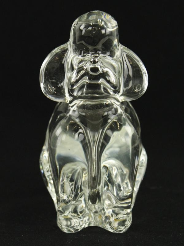 Dit decoratief object betreft een glazen kristallen poedelvormige schaal van Vannes Le Chatel, een stijlvol en speels designstuk met multifunctioneel karakter. Heldere, massieve glasvorm met mooie transparantie en glans, waarbij het licht op een levendige manier door het object speelt. De hond is gestileerd weergegeven in zittende houding met lange, afhangende oren en zachte, afgeronde vormen. Dankzij de uitgeholde binnenzijde kan het stuk ook gebruikt worden als sieradenhouder, snuisterijschaal of decoratieve schaal. Goede staat met normale lichte gebruiksporen; aan de linker voorpoot bevinden zich enkele kleine, diepere krasjes dicht bij elkaar. Verder mooi glanzend geheel. Onderaan gemerkt “Vannes France” en voorzien van originele zilverkleurige sticker “Vannes Le Chatel – Made in France”.