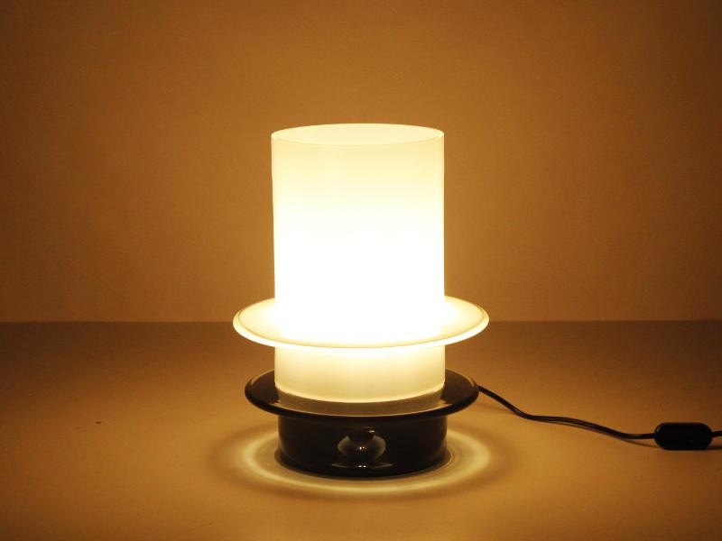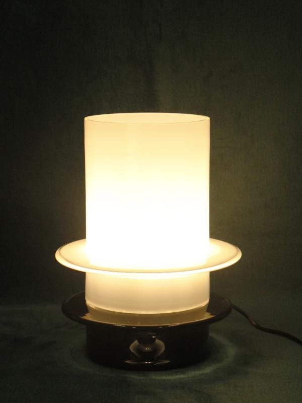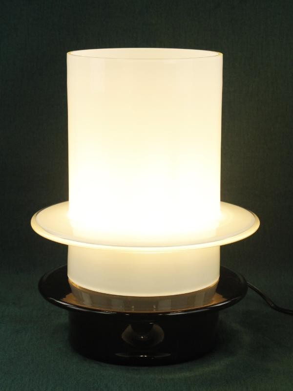 Deze lamp is opgebouwd uit zuivere geometrische vormen: een cilindervormige opaline glazen kap gecombineerd met een contrasterend zwart glazen onderstel. De horizontale schijf tussen beide delen fungeert visueel als een “zwevende rand”, wat het ontwerp licht en architecturaal maakt. Het gebruik van wit opaalglas zorgt voor een zachte, gelijkmatige lichtverspreiding zonder verblinding. Wanneer de lamp brandt, ontstaat een warme gloed die zowel functioneel als sfeervol is.