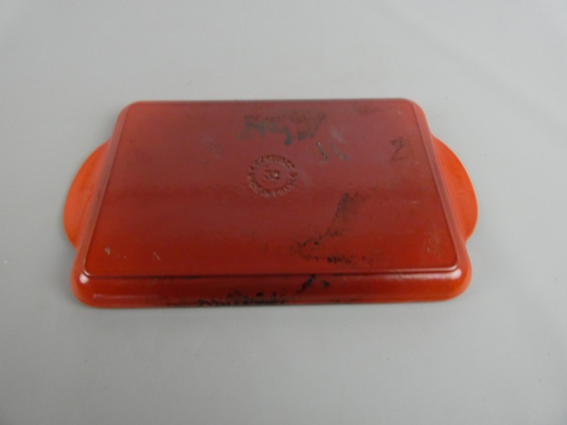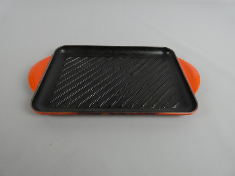 Kleur en Ontwerp: De buitenkant is uitgevoerd in de kenmerkende, levendige oranje kleur van Le Creuset. De binnenzijde (het grilloppervlak) is zwart geëmailleerd.