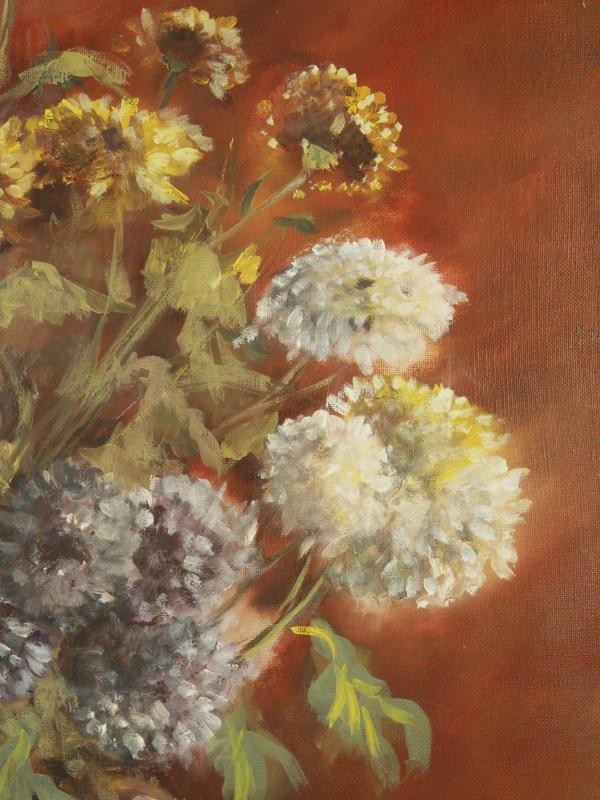 Groot bloemstilleven met witte, rode en paarsblauwe bloemen tegen een oranjerode achtergrond. Het schilderij is onderaan gesigneerd 'A. De Vree'. We vermoeden dat het een schilderij betreft van Albert De Vree.