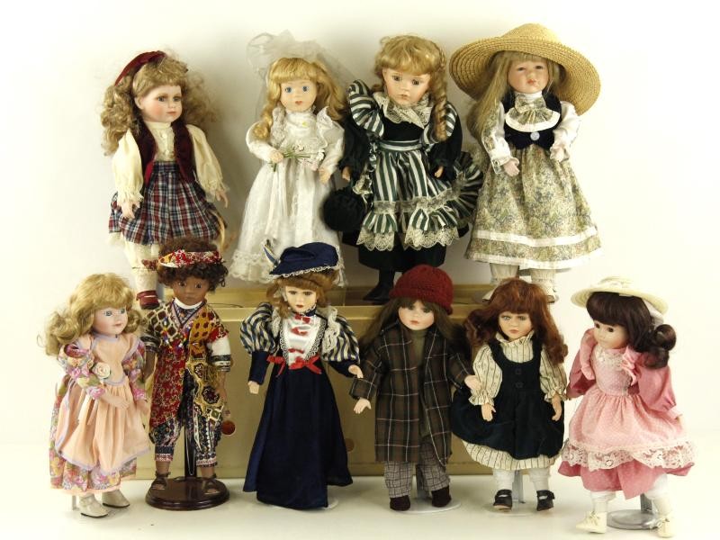 Groot en gevarieerd lot porseleinen poppen, elk stuk uniek in stijl, outfit en uitstraling.