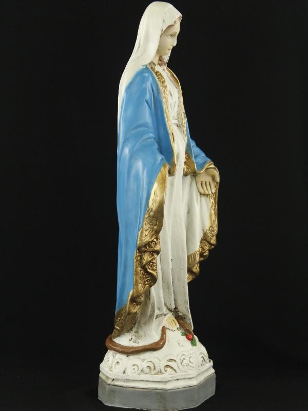 Dit grote Moeder Maria / Onze-Lieve-Vrouw beeld is vervaardigd uit epoxy en toont Maria in een traditionele, serene houding met een wit gewaad en een blauwe mantel met goudkleurige boord. Aan haar voeten is een slangenmotief zichtbaar, een klassiek symbool binnen religieuze iconografie. Het geheel staat op een sierlijk vormgegeven sokkel met decoratieve patronen.