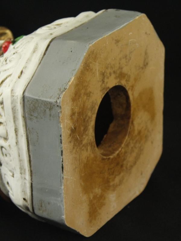 Door de tweedehandsstaat vertoont het beeld duidelijke gebruikssporen. Vooral in het gezicht en verspreid over de volledige oppervlakte zijn slijtplekken, verfverlies, verkleuring en kleine beschadigingen zichtbaar. Het beeld werd grondig schoongemaakt met warm water en zeep, maar in sommige plooien blijven nog lichte restjes nicotine aanwezig. Daarnaast is op enkele plaatsen het onderliggende materiaal (hout) zichtbaar geworden.