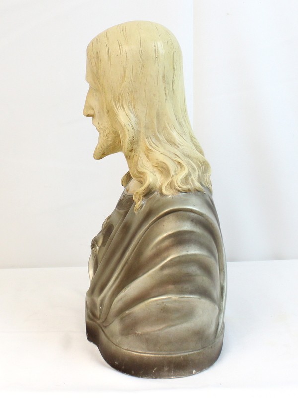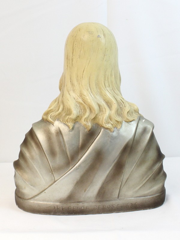 Grote relegieuze buste gemaakt van gips in de vorm van Jezus Christus, van 'Art Belge Depose' met serienummer 525.