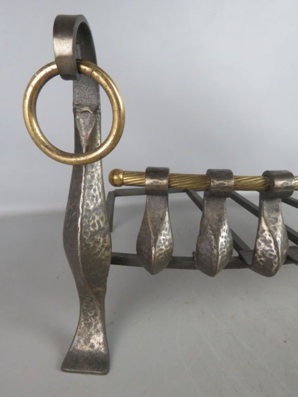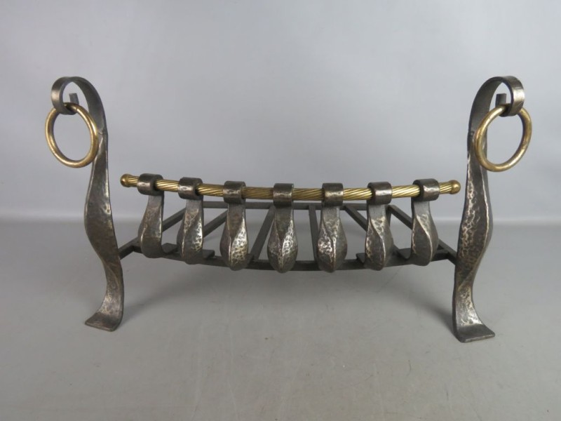 Dit is een haardbok van metaal met de afmetingen 57 x 35 x 34 cm. Het object bestaat uit een metalen rooster op poten en is aan de voorzijde gedecoreerd. De decoratie omvat twee verticale, hamerteken-achtige delen aan de zijkanten, die aan de bovenkant voorzien zijn van messing ringen. Tussen deze verticale delen is een horizontale, gedraaide messing staaf geplaatst. Aan deze staaf hangen zeven metalen, druppelvormige ornamenten met een gehamerd oppervlak, die met metalen beugels zijn bevestigd. Het geheel heeft een rustieke en ambachtelijke uitstraling, geschikt voor gebruik in een open haard.