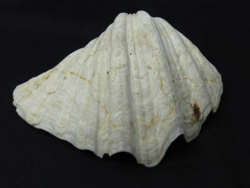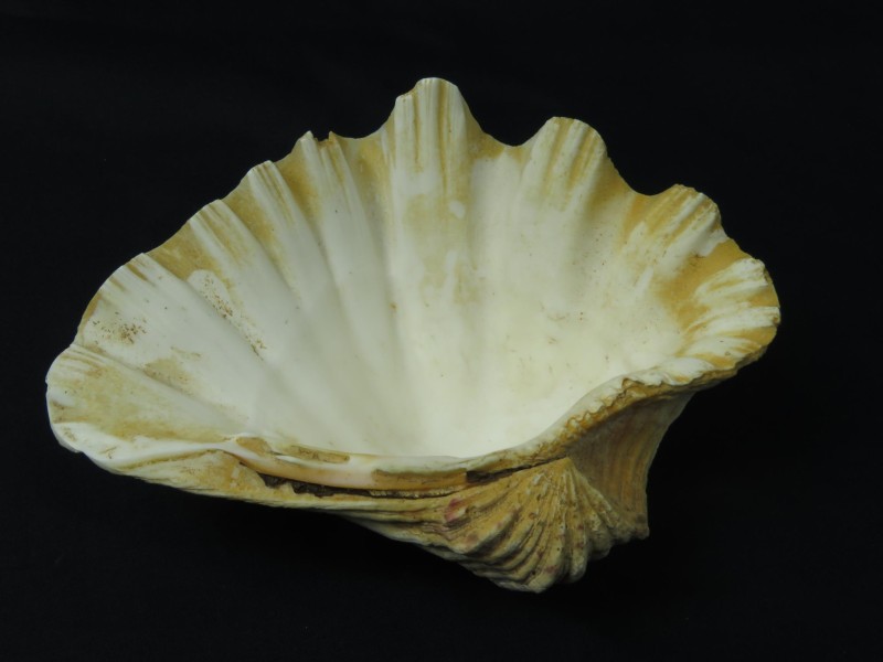 Een halve reuzenschelp. Gekartelde schelp, voornamelijk wit - beige met enkele kleuraccenten.