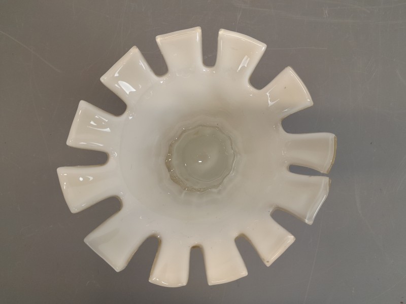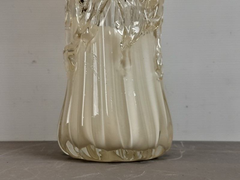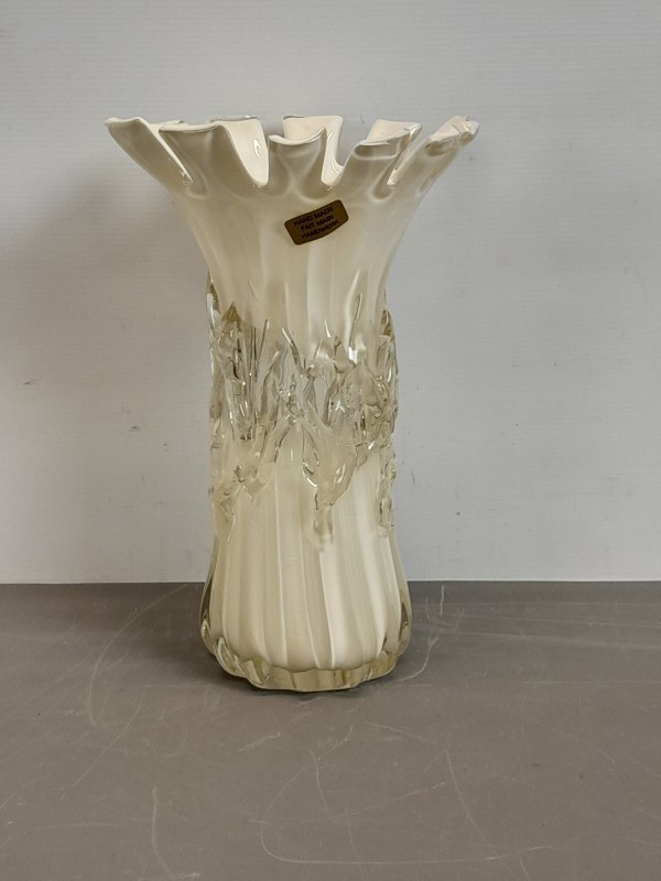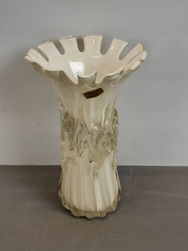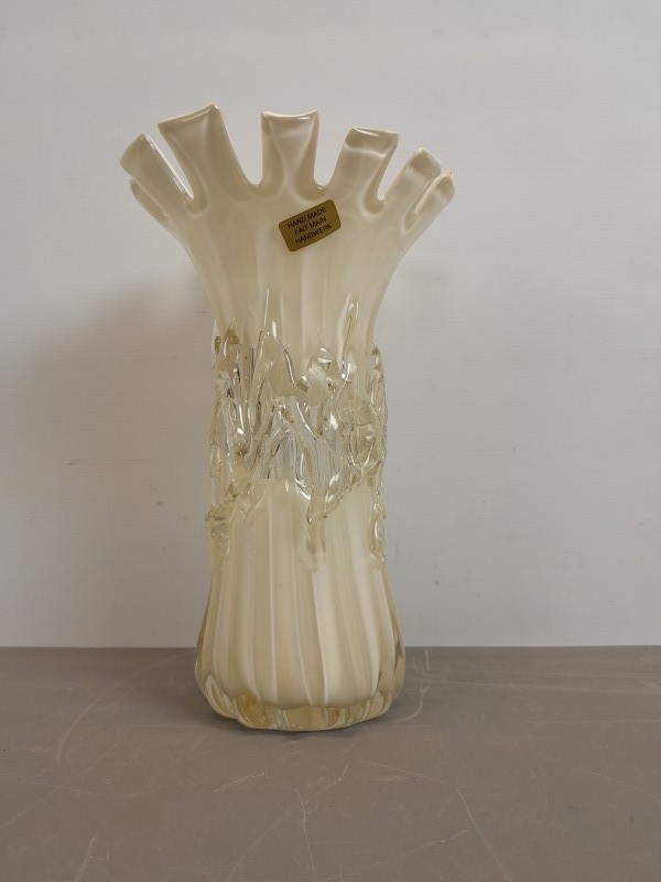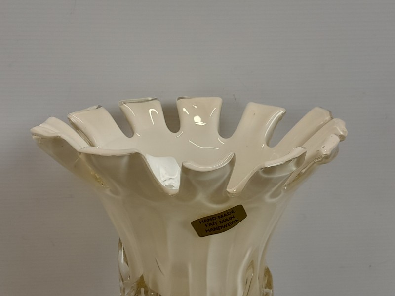 Deze handgemaakte art-glass vaas valt direct op door haar organische vorm en het speelse samenspel tussen ivoortinten en helder glas. De brede geplooide rand geeft het stuk een opvallende sierlijke uitstraling, terwijl de met de hand aangebrachte glasstructuren langs de hals zorgen voor een levendig en ambachtelijk karakter. Een decoratief object dat warmte en kunstzinnigheid toevoegt aan elke ruimte.