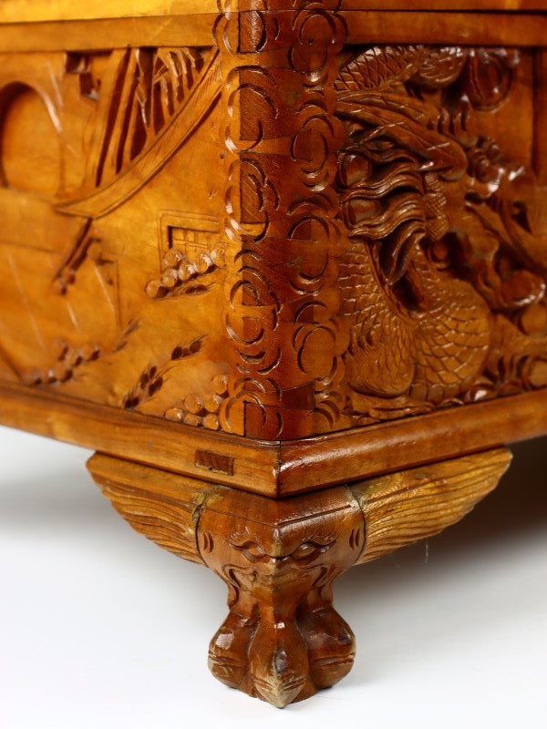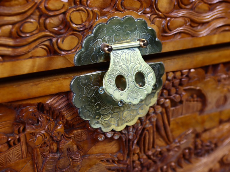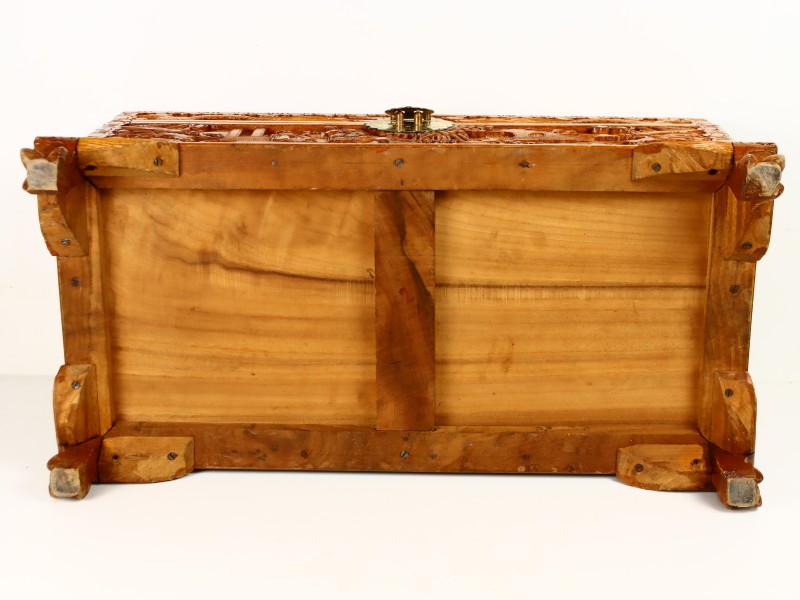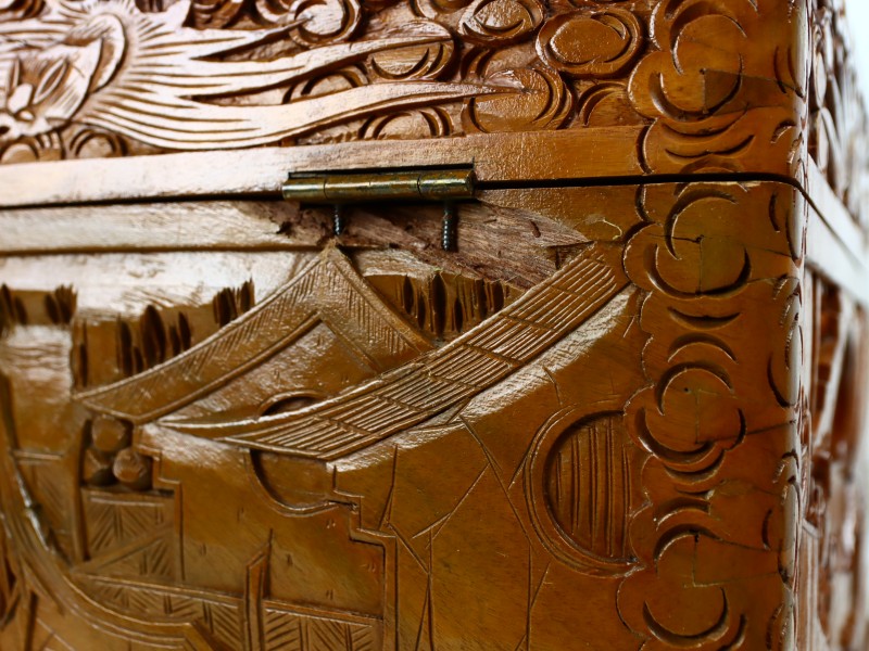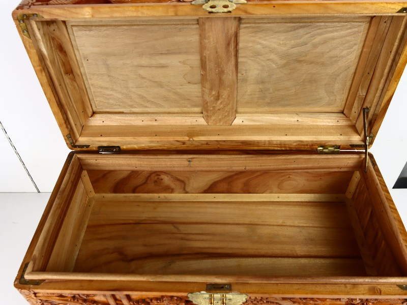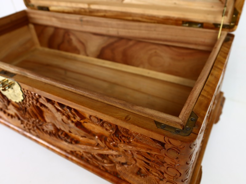 Prachtige handgesneden Oosterse kist, mogelijk gemaakt van geurend hout zoals sandelhout, kamferhout of cederhout, houtsoort is niet duidelijk. Deze kist combineert vakmanschap met een heerlijke, natuurlijke geur die jarenlang blijft.