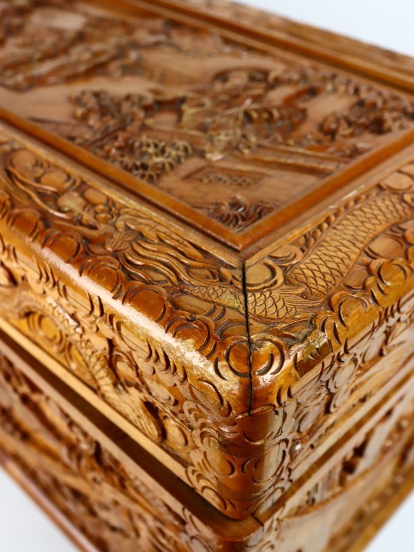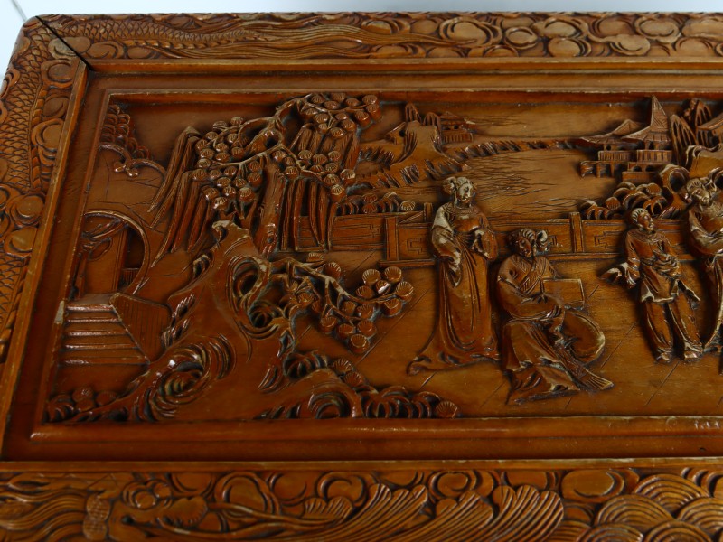 Rijke houtsnijwerkjes met landschappen, draken, figuren, bomen en boten