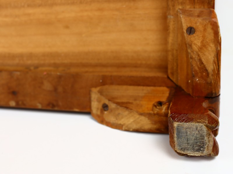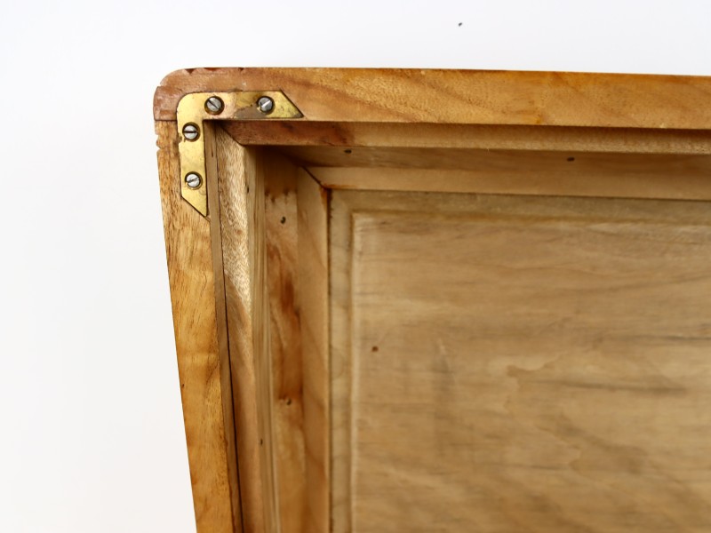 De kist is beschadigd, achteraan is het linkerscharnier los, afgebroken. Het losgekomen stukje hout zit in de kist en kan dus hersteld worden. Zie foto's. Het deksel sluit niet meer goed aan de rechterkant.