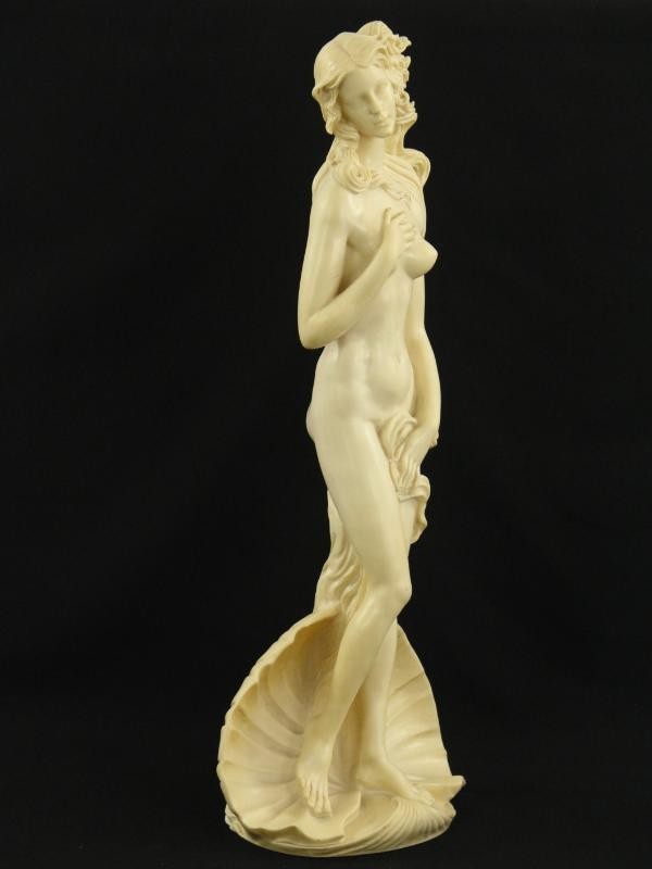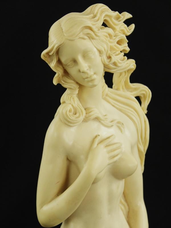 Dit beeld van Venus is uitgevoerd in hars en geïnspireerd op het beroemde schilderij De Geboorte van Venus van de Italiaanse renaissanceschilder Sandro Botticelli (1445–1510). De voorstelling toont de godin van de liefde en schoonheid, rechtopstaand op een schelp, met haar golvende haar dat sierlijk om haar heen valt. Het beeld is uitgevoerd in een zachte ivoorkleurige tint en zorgvuldig gemodelleerd met vloeiende lijnen en verfijnde details, typerend voor de klassieke renaissancestijl.