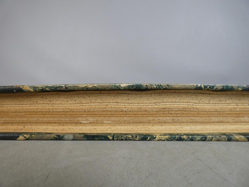 Harde kaft bekleed met donkergroen textiel en gemarmerd papier.