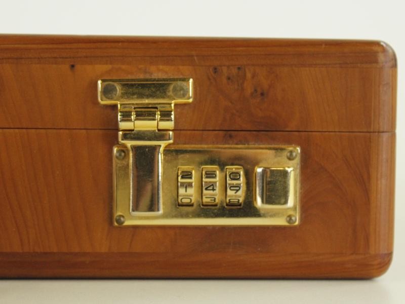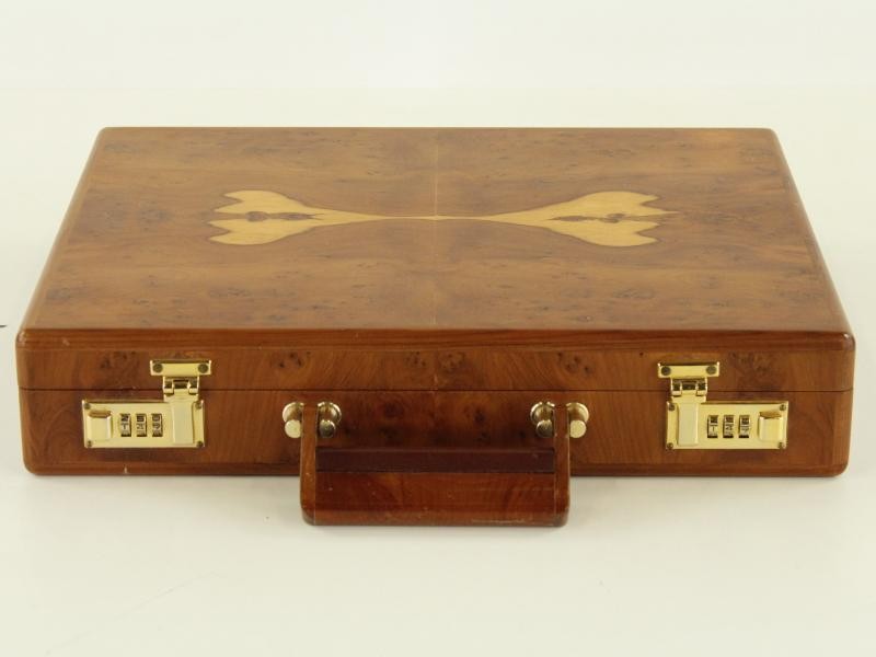 Dit stijlvolle attachékoffertje is uitgevoerd in hout met een fraai wortelfineer, wat zorgt voor een warme en luxueuze uitstraling.