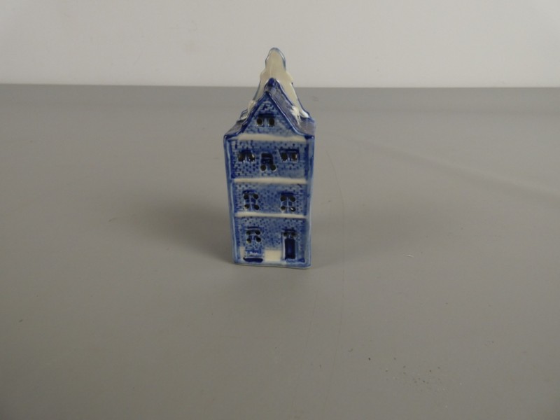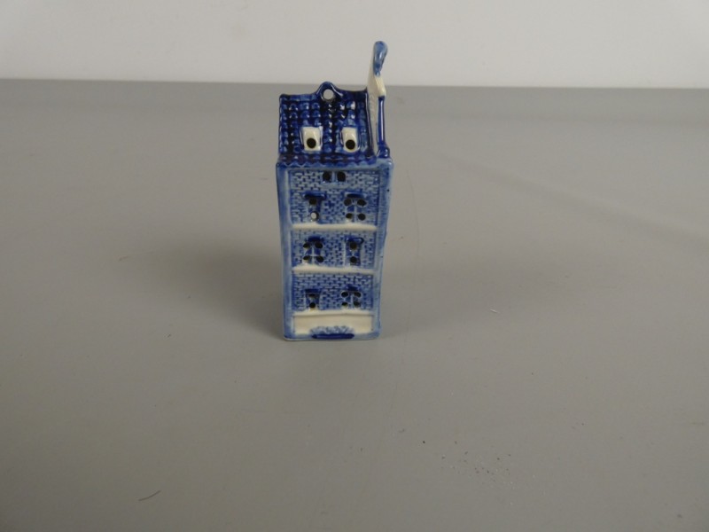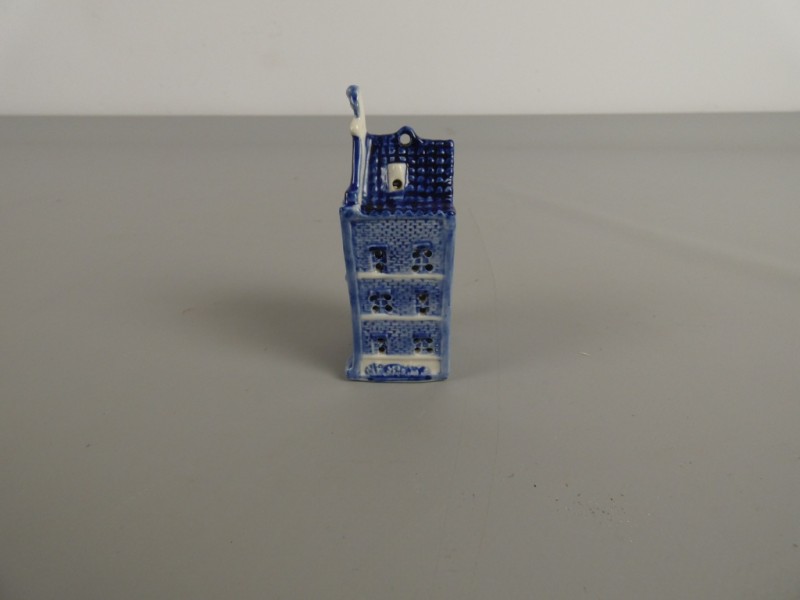 Dit is een klein, blauw-wit keramieken souvenir uit Amsterdam, uitgevoerd in de stijl van het bekende Delfts blauw.
