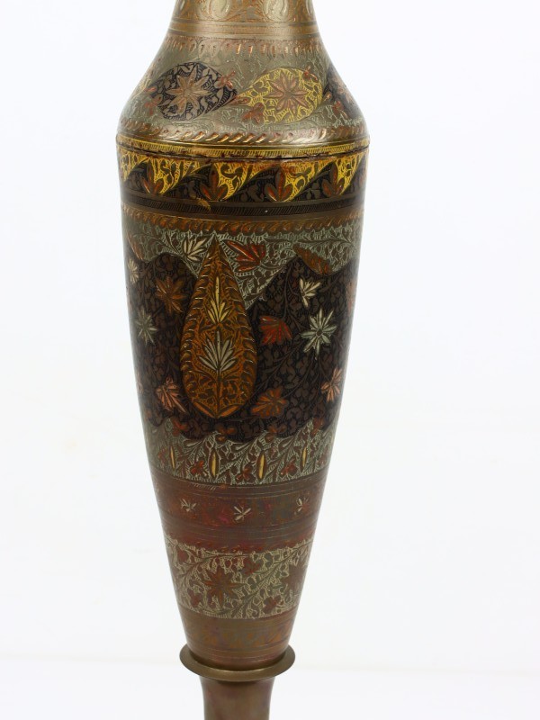 Prachtige lange vaas uit India, gemaakt van messing en voorzien van elegante inkepingen en reliëfdecoraties. Dit ambachtelijke werkstuk straalt traditionele Indiase vakmanschap uit en is een opvallend decoratief element voor elk interieur. Geel, groen, roze, zwart tinten.