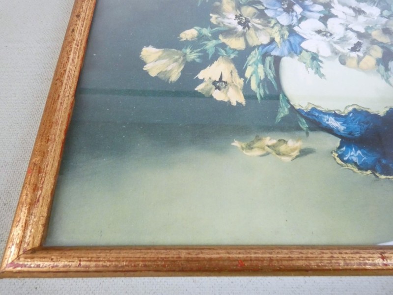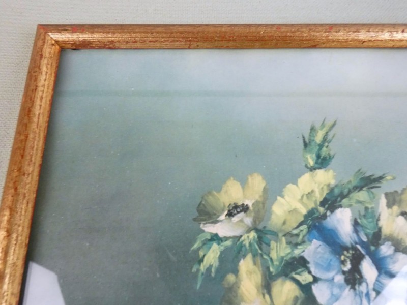 Ingelijste prent of reproductie van een bloemstilleven.