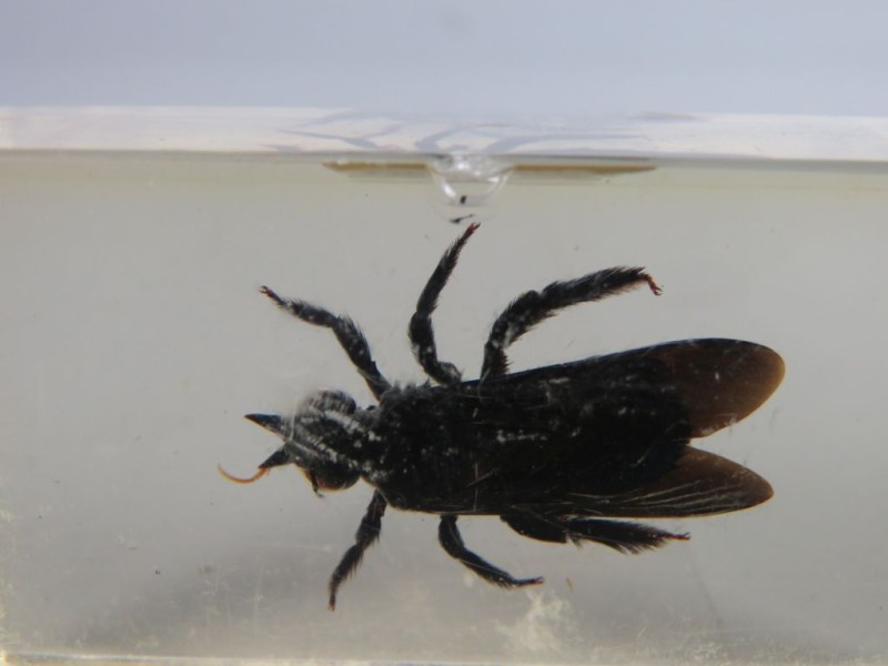 Op basis van de omvang, de donkere kleur en de harige poten is de kans groot dat het een exemplaar is van een grote bij- of wespachtige, mogelijk een Houtbij (Xylocopa soort) of een zeer grote vlieg- of wespensoort. Vanwege de verduistering en de bewerking is het moeilijk om de exacte soort vast te stellen.