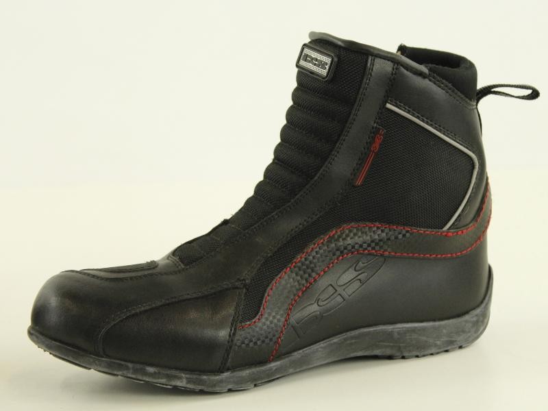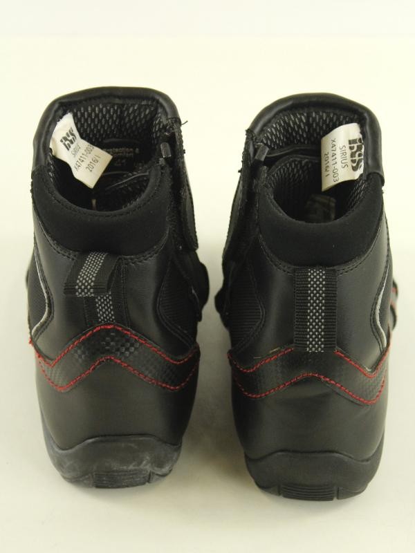 Degelijke en comfortabele motorlaarzen van IXS, model Sirius, uitgevoerd in zwart leder met sportieve rode stiksels.