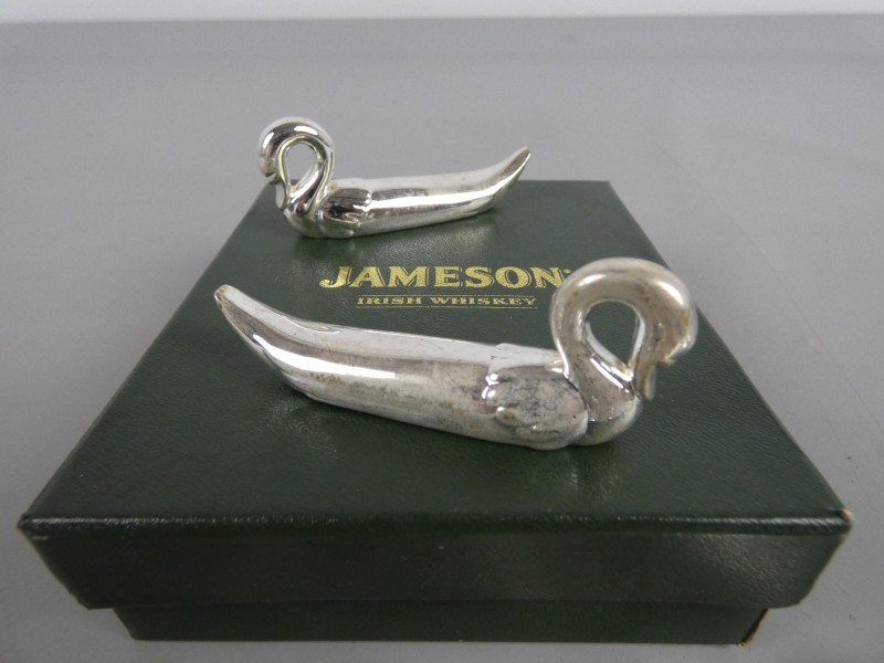 Voeg een vleugje Ierse klasse toe aan uw gedekte tafel met deze unieke set Jameson messenleggers. Deze verzilverde houders zijn uitgevoerd in de vorm van een elegante zwaan, een stijlvol detail voor de echte liefhebber van whiskey en antiek tafelzilver.